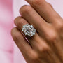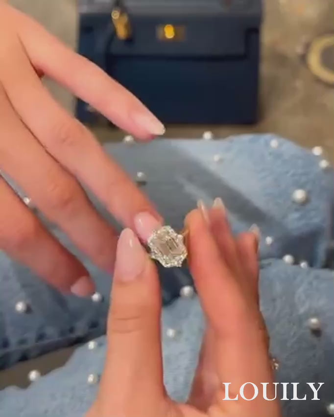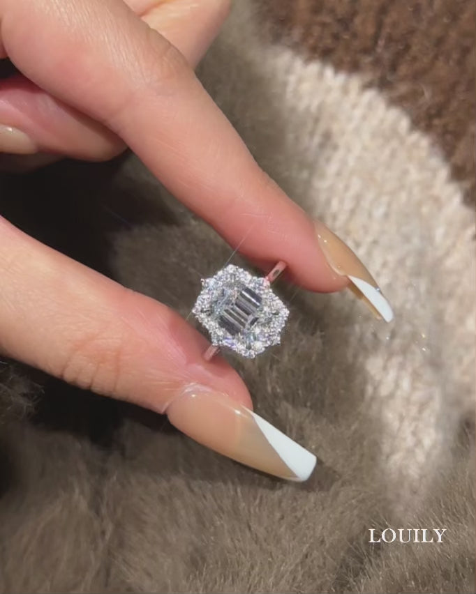 The Vintage 3.0 Carat Halo Emerald Cut Engagement Ring in Sterling Silver is a breathtaking blend of old-world charm and modern sophistication. At its heart, a striking emerald-cut center stone takes center stage, exuding timeless grace with its clean lines and mesmerizing depth. Surrounding it, a delicate halo of shimmering stones enhances its brilliance, creating a luminous glow reminiscent of vintage heirloom designs.