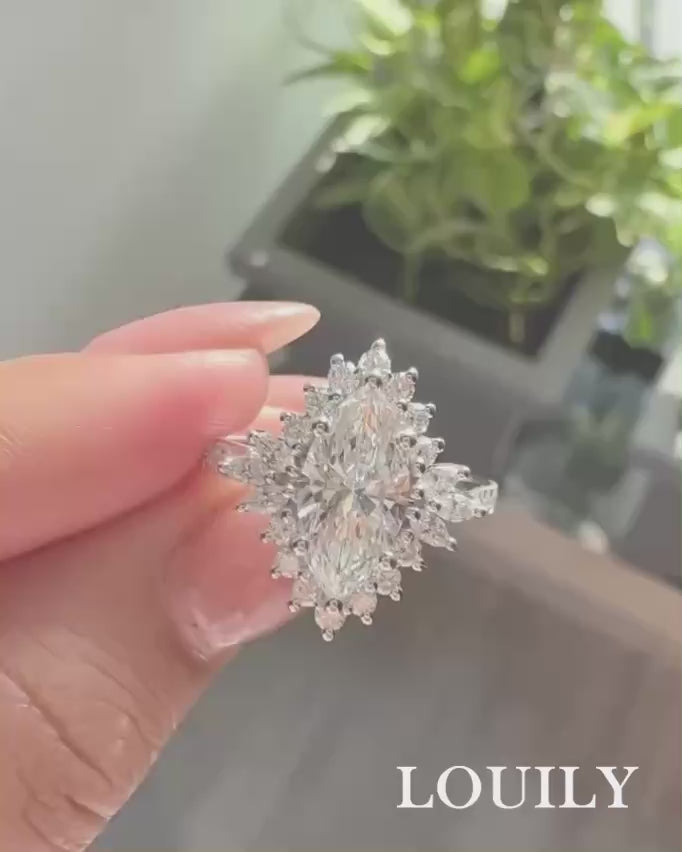 It is a graceful blend of antique elegance and modern practicality. At its center sits a stunning 3.0 carat marquise cut stone, elongated to create a flattering, finger-lengthening effect. Surrounding it, a delicate halo of sparkling accents enhances the brilliance while adding a touch of vintage-inspired sophistication.