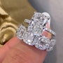 This 5.5Ct cushion cut wedding ring set exudes elegance with its vintage-inspired design. The bold cushion cut center stone is paired with a halo emerald cut half wedding band, creating a harmonious blend of old-world charm and modern sophistication.