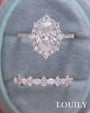This set showcases a 3.0 carat oval cut engagement ring framed with a delicate halo, paired with a uniquely designed wedding band that adds character and individuality. The combination highlights timeless elegance while offering a distinctive style that feels one-of-a-kind.
