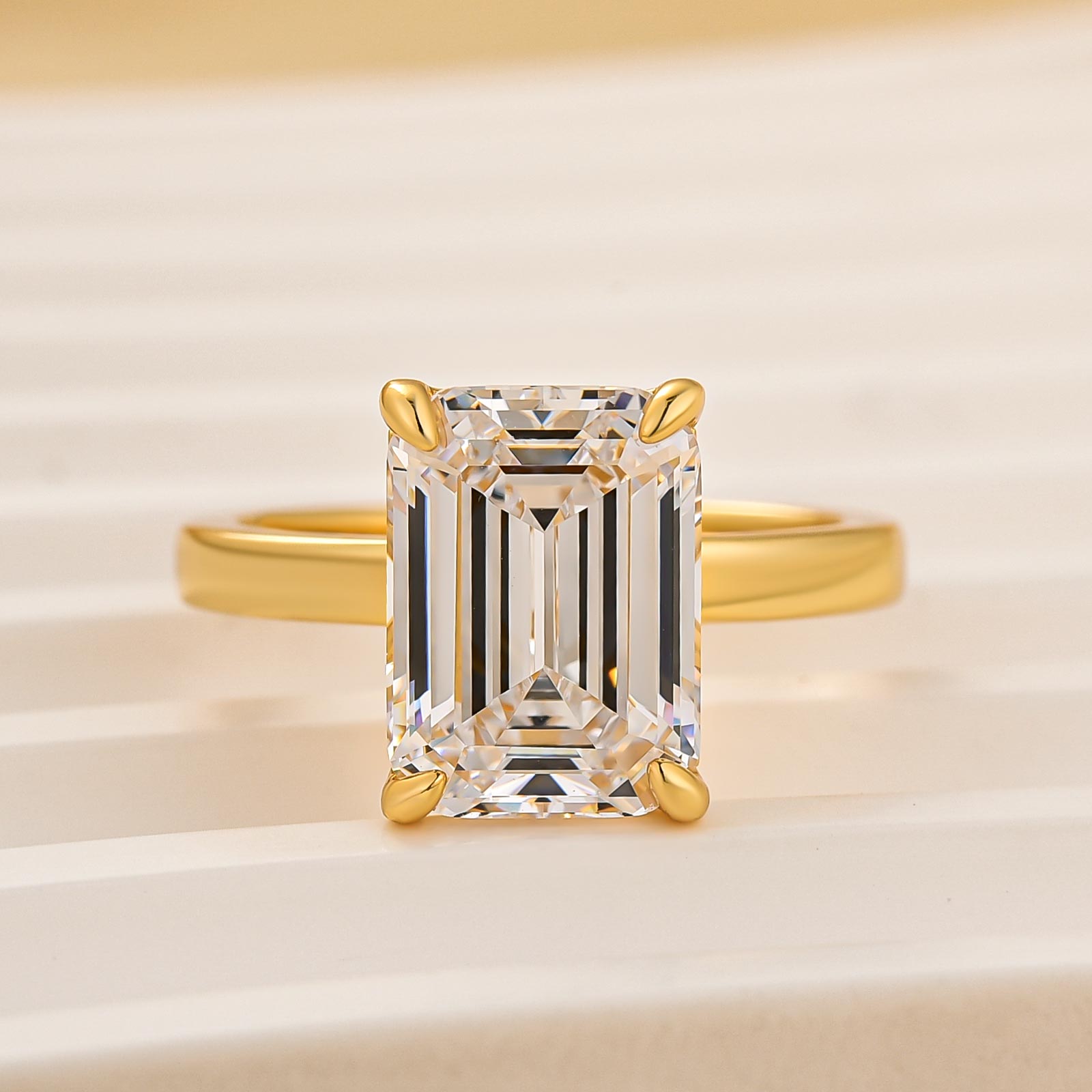 Design Inspiration: Inspired by refined luxury and timeless artistry, this 4.5ct emerald-cut gemstone ring captures beauty in its purest form. The clean, mirror-like facets of the emerald cut reflect clarity, confidence, and enduring grace, while the yellow gold band adds a touch of warmth and sophistication. Elegant yet powerful, this design celebrates a love that is steady, luminous, and infinitely classic.
