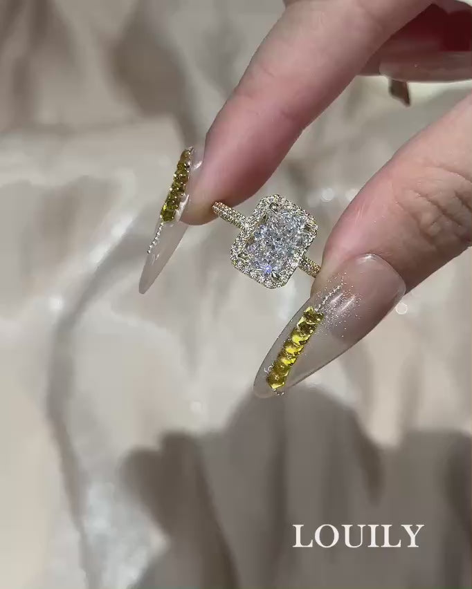 This ring was designed for the woman who embraces both elegance and excitement, featuring a dazzling 3.5 carat radiant cut center stone framed by a sparkling halo. Crafted in sterling silver, it captures the light—and attention—wherever you go, making it the perfect choice as a stunning travel ring or a bold statement piece for everyday wear. Wear it solo for a sleek, sophisticated feel, or stack it for added brilliance.