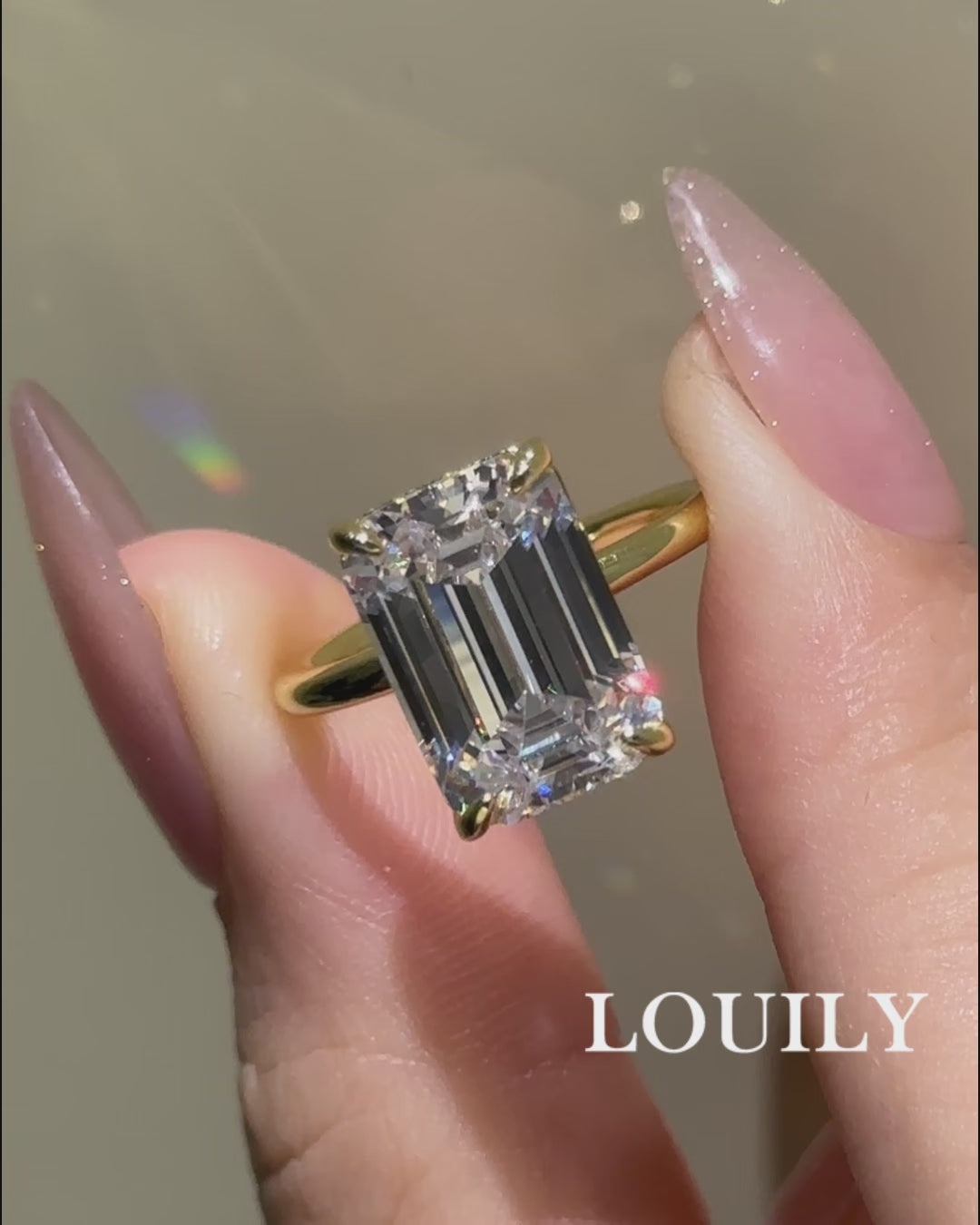 This ring is celebrated for its hall-of-mirrors brilliance and architectural lines. Set in yellow gold, the solitaire design magnifies the stone’s natural elegance, allowing its clarity and geometry to take center stage.It is inspired by the grandeur of classic architecture and the purity of enduring love, the emerald cut represents honesty, clarity, and strength. Its bold linear facets echo the elegance of timeless design, while the warm glow of yellow gold evokes richness and eternal light. Together, they create a ring that is not only a promise, but an heirloom destined to shine across generations.