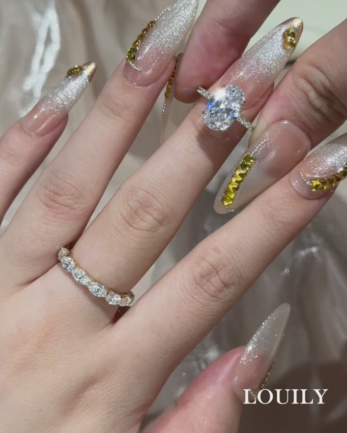 This ring set was designed for the woman who cherishes classic beauty, featuring a stunning 4.0 carat oval cut center stone that sparkles with soft, captivating brilliance. Paired with an oval cut wedding band, it creates a seamless look full of graceful curves and understated glamour. Perfect as a wedding set or as elegant travel rings, it can be worn together for a harmonious statement or styled separately for versatile sophistication.