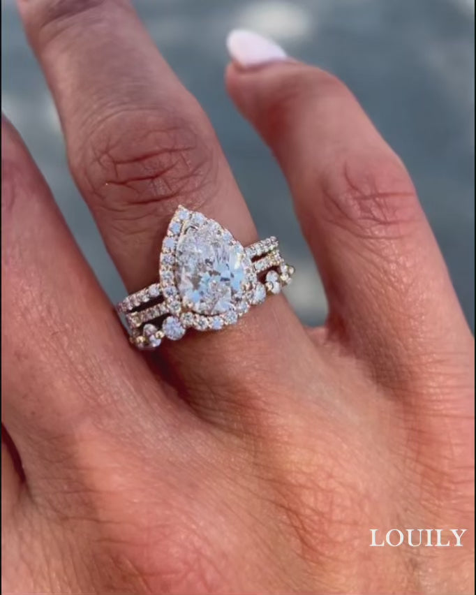 Louily 3PC Classic Halo Pear Cut Wedding Ring Set With Eternity Wedding Bands