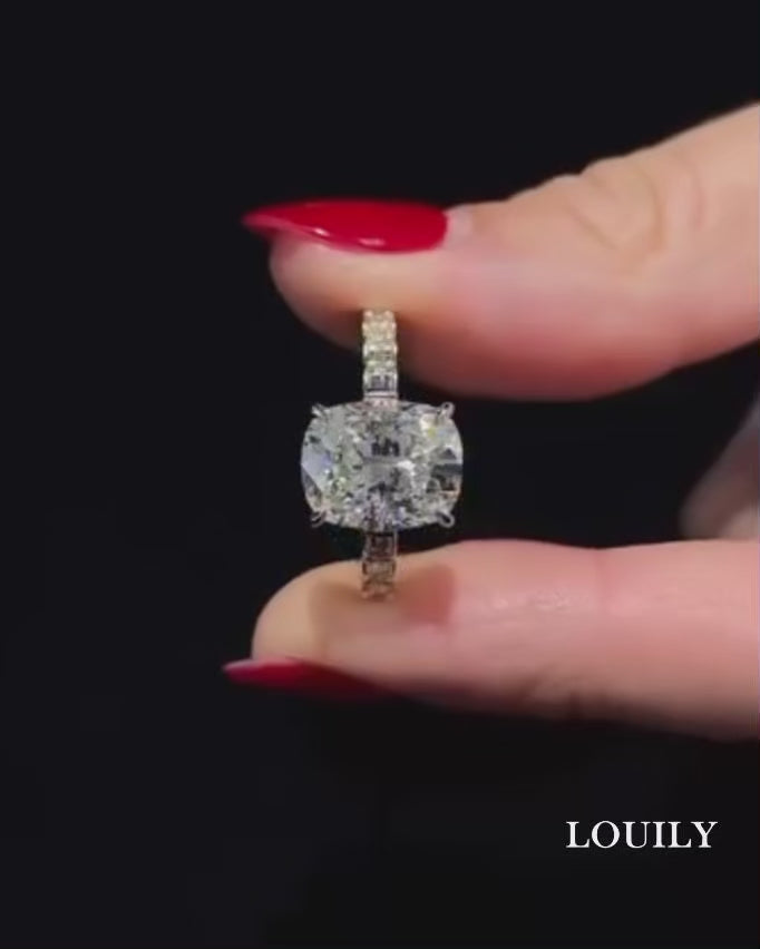Lining the band, emerald-cut accent stones bring a striking contrast with their sleek, elongated silhouettes. Their step-cut facets offer a captivating depth, balancing the fiery brilliance of the cushion-cut center with an air of timeless refinement.