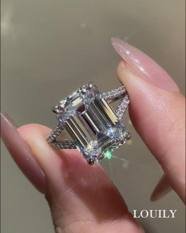 This 10.0Ct emerald cut split shank engagement ring in sterling silver captures attention with its oversized, elegant center stone and a beautifully designed split shank band. The split design adds dimension and balance, making the large stone feel both luxurious and sophisticated.