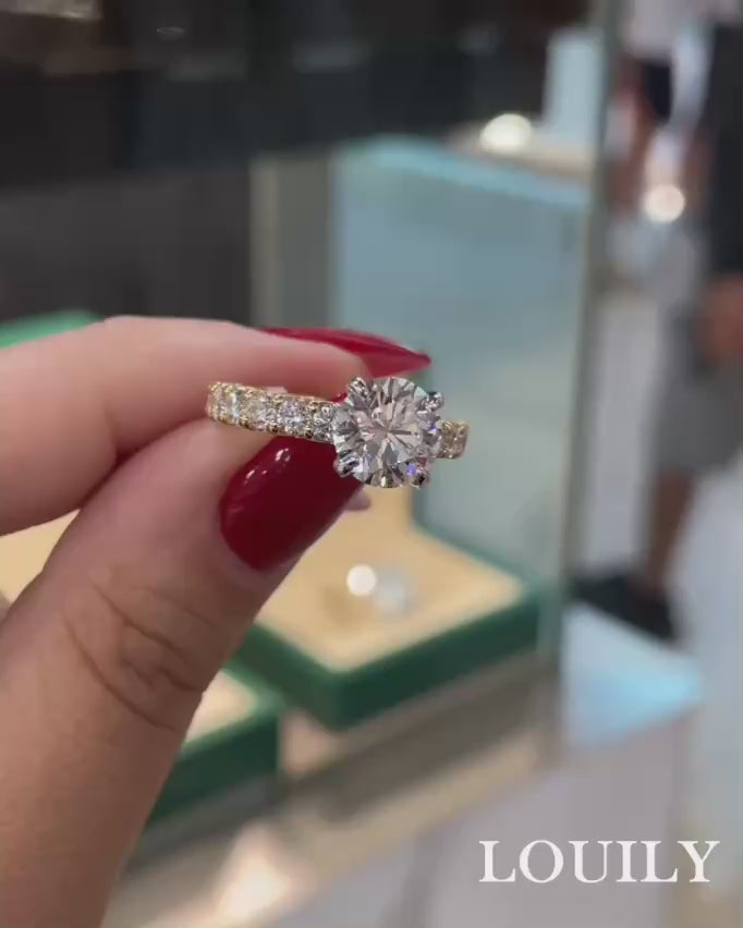 It is a sleek and sophisticated design that brings beauty and practicality together. At the center, a sparkling 2.0 carat round cut stone captures light from every angle, while the hidden halo of smaller stones adds an extra touch of brilliance without overwhelming the design.