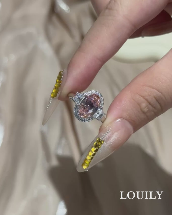 This 2.5Ct engagement ring features a stunning oval cut pink stone surrounded by a halo that adds extra brilliance and charm. The three-stone setting symbolizes love and commitment, making it a meaningful promise ring for her. The delicate halo enhances the center stone’s sparkle, while the side stones add balance and elegance. Perfect for someone who loves a touch of color combined with classic sophistication, this ring is both eye-catching and heartfelt.