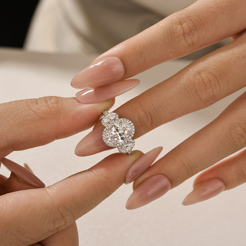 It in sterling silver brings together classic beauty and thoughtful design. At the center sits a luminous 2.5 carat oval cut stone, surrounded by a shimmering halo that enhances its brilliance from every angle. Flanked by two sparkling side stones, this three-stone arrangement symbolizes the past, present, and future of your love.