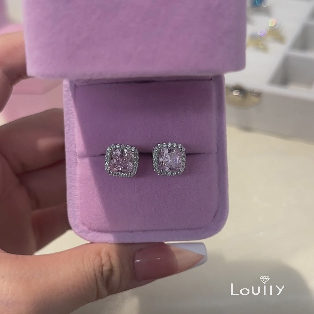 4.0 Carat Halo Square Princess Cut Pink Sapphire Sterling Silver Women's Stud Earrings