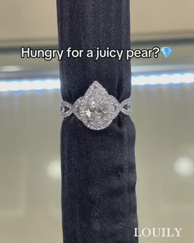 It is where romantic design meets everyday wearability. Featuring a brilliant 4.0 carat pear-cut center stone surrounded by a luminous halo, this ring captures the light from every angle and adds a radiant glow to your hand. The graceful twisted band adds a contemporary flair while symbolizing the intertwining of two hearts and paths.