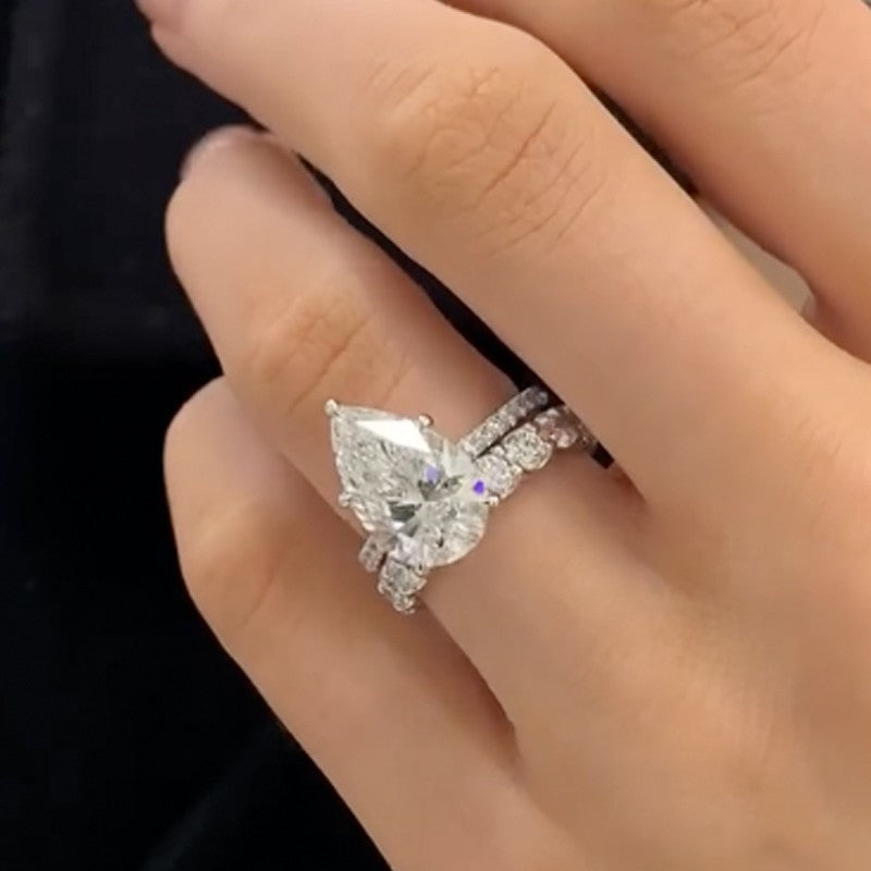 This 4.5Ct pear cut wedding ring set is a perfect combination of grace and glamour. The center pear-shaped stone draws the eye with its unique silhouette, while the round cut eternity band adds a continuous line of sparkle that beautifully enhances the main ring. Together, they create a balanced and timeless set that feels luxurious yet classic—ideal for anyone who wants something a little different but still deeply romantic.