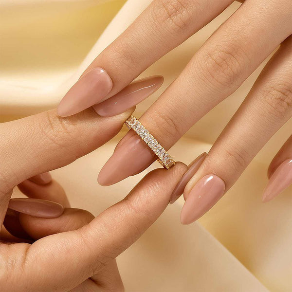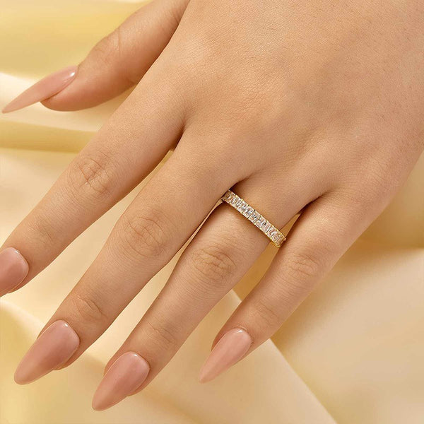 This 4.5Ct Radiant Cut Eternity Wedding Band in sterling silver is a celebration of everlasting love. Each radiant-cut stone is meticulously set to create a continuous band of light, symbolizing an unbreakable bond. The sleek sterling silver setting offers a contemporary touch, balancing luxury with everyday wearability. Whether worn alone or stacked, this design captures both modern style and timeless sentiment.