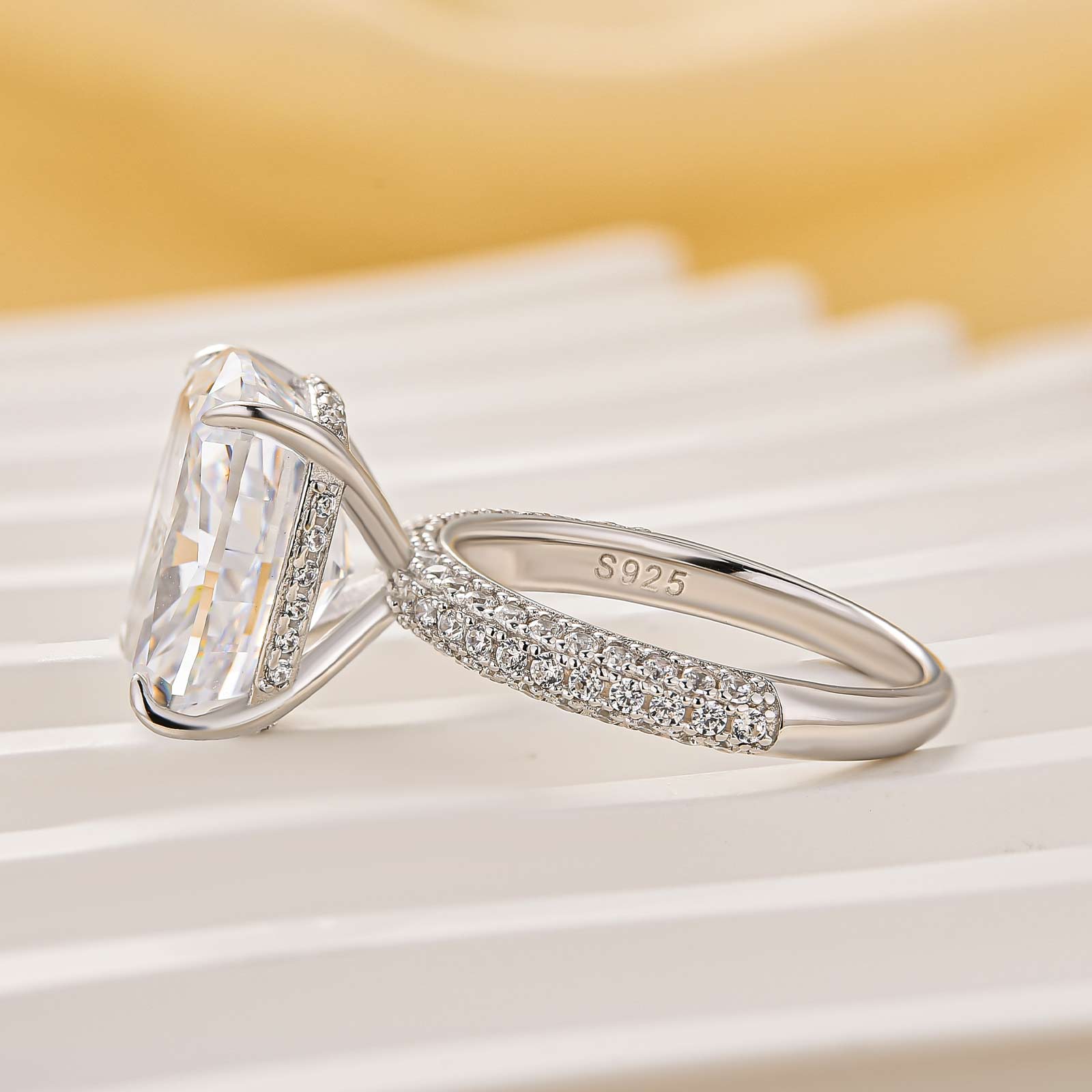 Design Inspiration:This engagement ring is inspired by the radiant journey of love—bold, bright, and filled with endless possibilities. The 6.0ct radiant-cut center stone symbolizes a love that shines with clarity and strength, lighting the way through every adventure. The side stones add extra brilliance, representing the many moments of joy and connection along the path. Crafted in sterling silver, the ring is designed to be as enduring as the love it represents, making it the perfect companion for the journey ahead.
