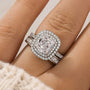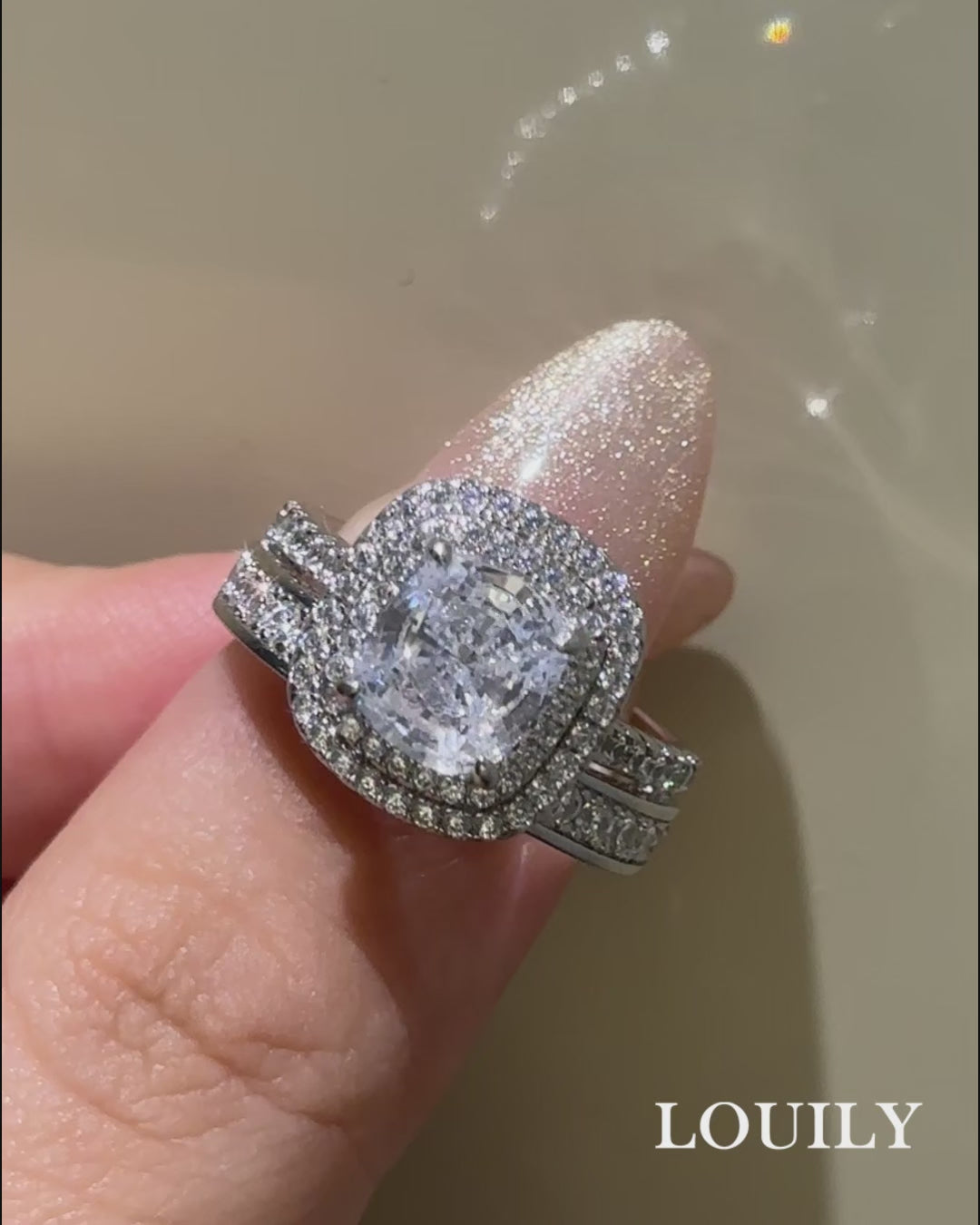 This ring set features a brilliant 2-carat cushion-cut center framed by a dazzling double halo for maximum brilliance. Paired with a sleek channel-set wedding band, it blends timeless elegance with contemporary detailing, creating a look that feels both sophisticated and unforgettable.