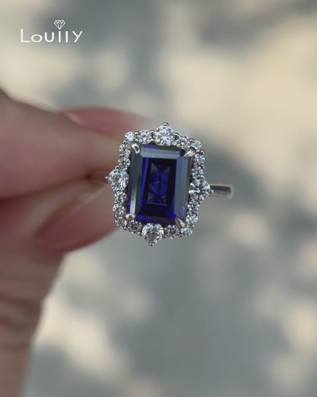 Louily 3.0 Carat Halo Emerald Cut Blue Sapphire Engagement Ring In Sterling Silver