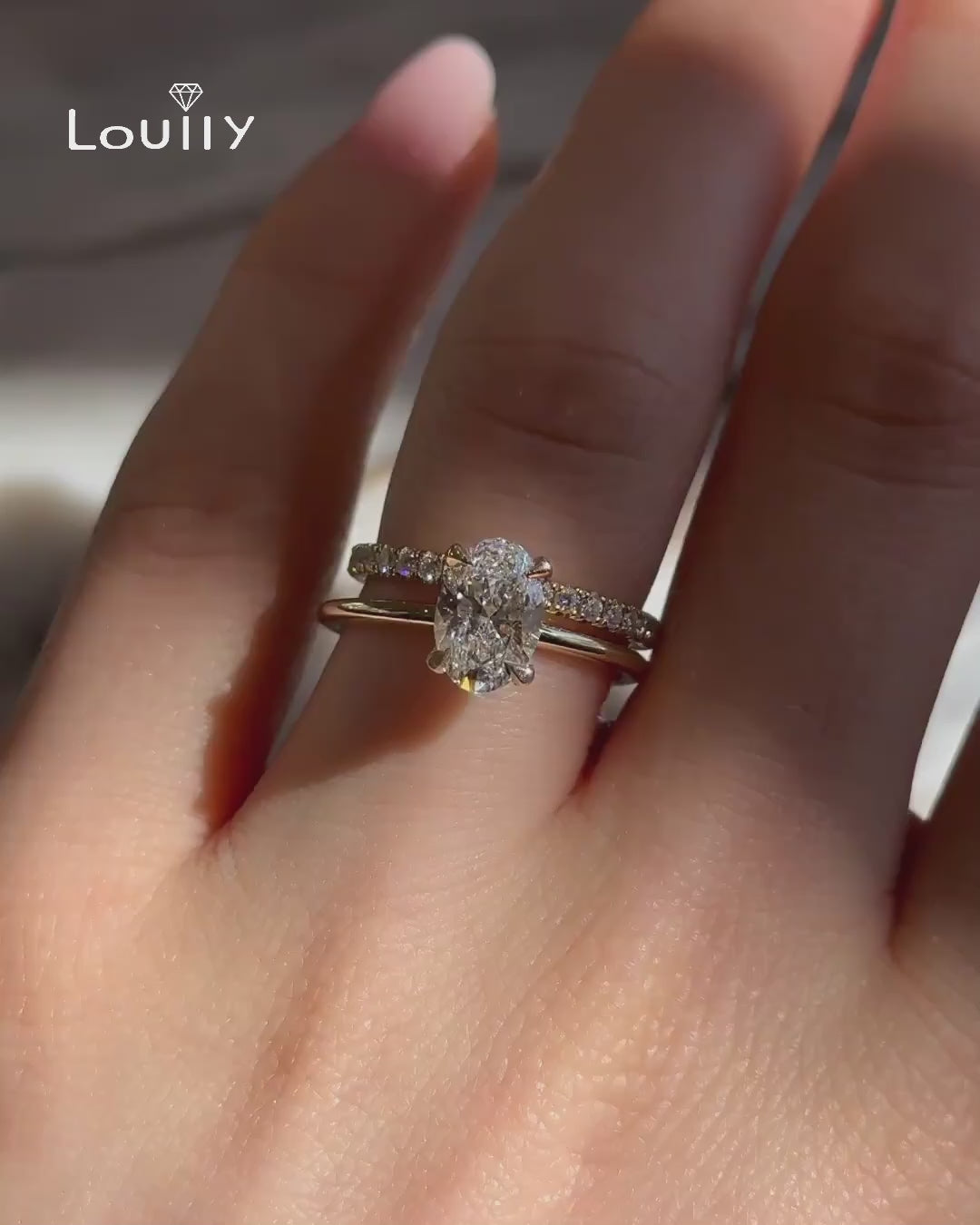 The Louily Dainty Yellow Gold Oval Cut Wedding Ring Set is an exquisitely crafted tribute to forever love. This luxurious set of rings features an elegant oval cut diamond framed by a shimmering halo of pavé diamonds, set in a dazzling 18K yellow gold band. Celebrate your union with a timeless reminder of your eternal commitment.