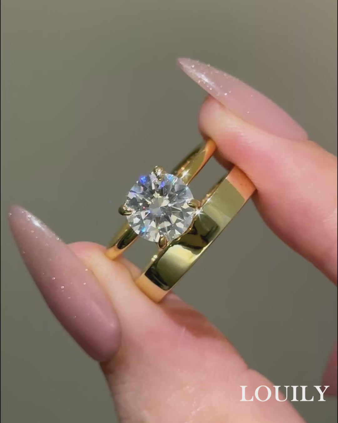 Louily Moissanite 2.0 Carat Round Cut Yellow Gold Wedding Ring Set With Wide Wedding Band