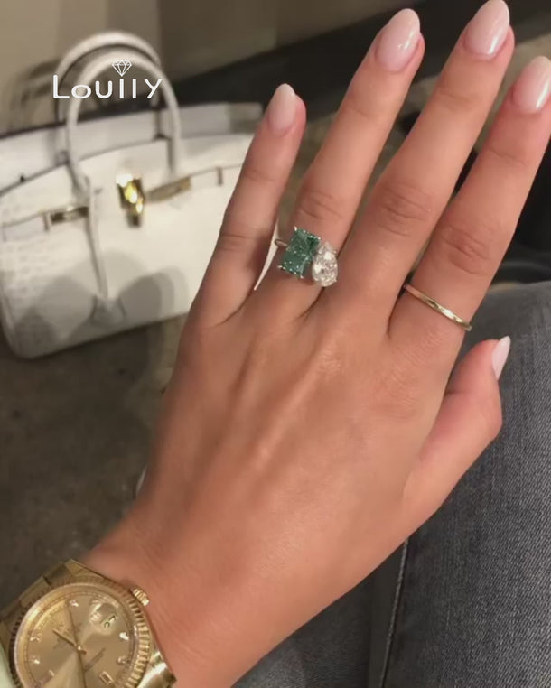 Louily Unique Double Stones Design Radiant & Pear Cut Engagement Ring In Sterling Silver