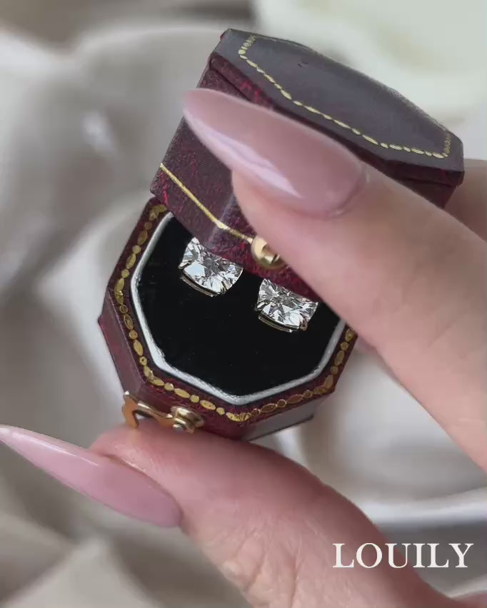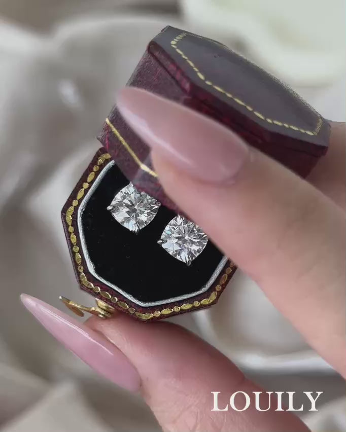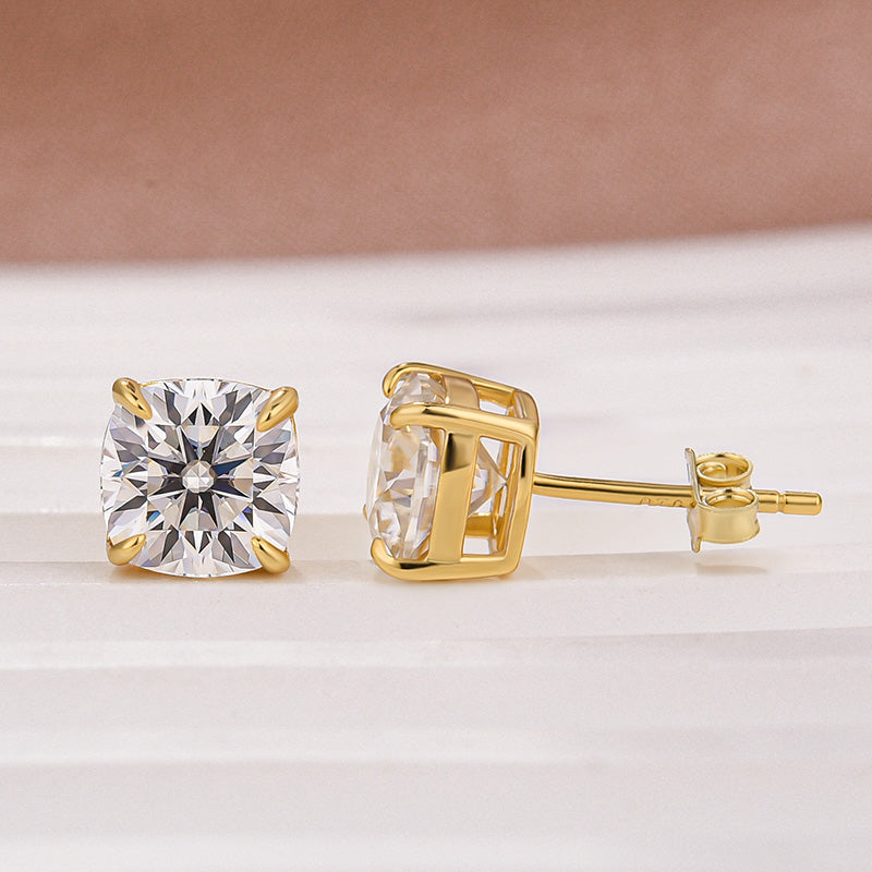 These are the perfect blend of luxury and simplicity. Each earring showcases a brilliant 2.0 carat cushion cut moissanite, known for its soft corners and exceptional sparkle. Set in a refined white gold finish & yellow gold finish, these studs exude classic elegance with a contemporary edge.