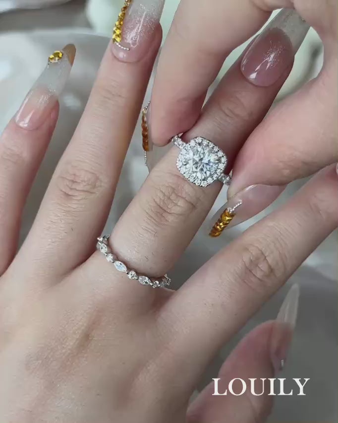 It is a stunning two-piece set that captures the elegance of commitment and the beauty of shared memories. The main ring features a 2.0 carat round cut moissanite, embraced by a shimmering halo for amplified brilliance and classic appeal.