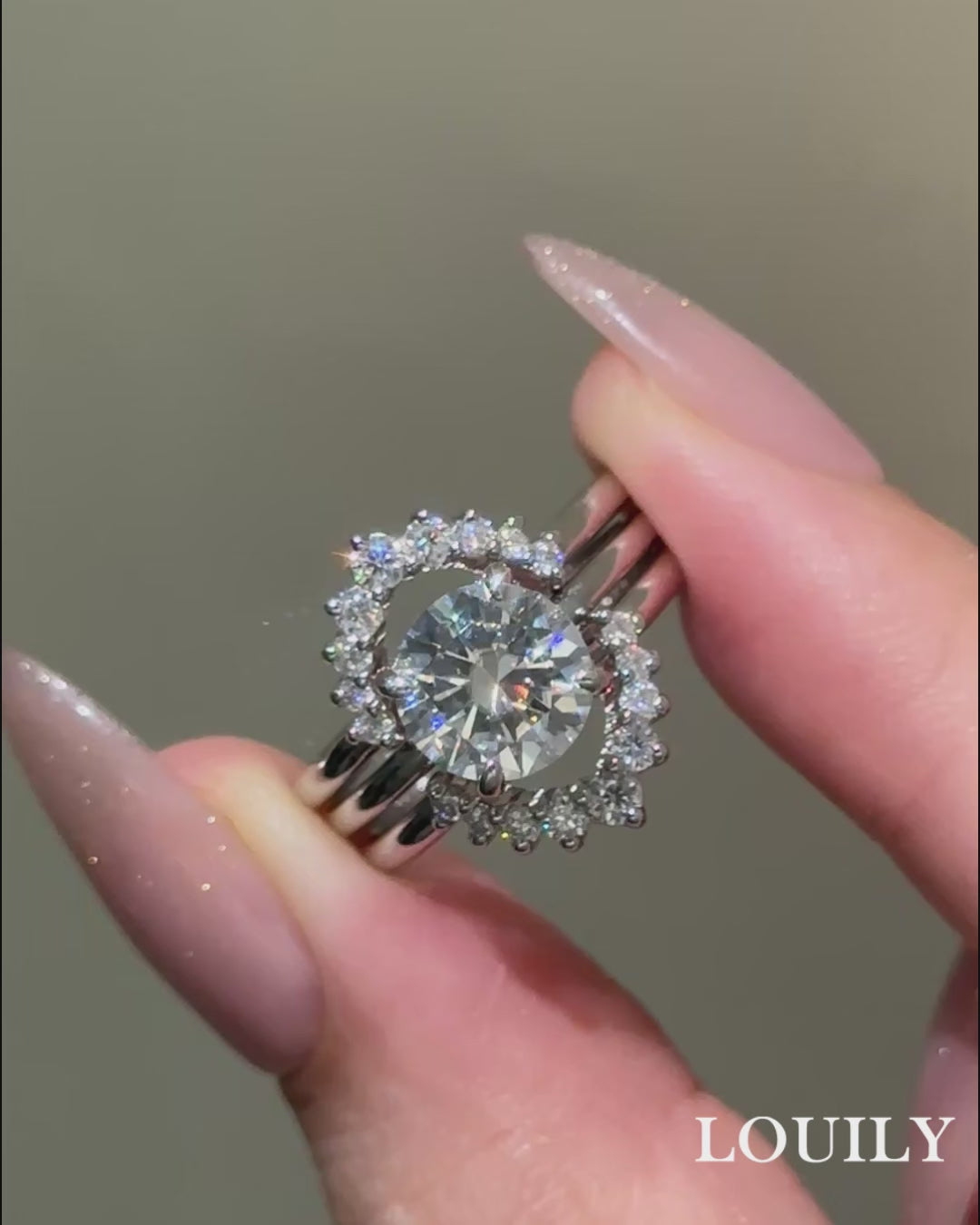 This 2.0Ct halo round cut moissanite promise ring in white gold is absolutely radiant—the halo setting enhances the brilliance beautifully, and the center stone sparkles like crazy. The included round cut and marquise cut anniversary ring adds a unique and romantic touch that sets it apart from more traditional sets.